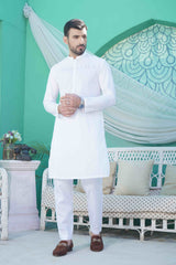 Men Unstitched White Kameez Shalwar With Cotton Thread Cutwork